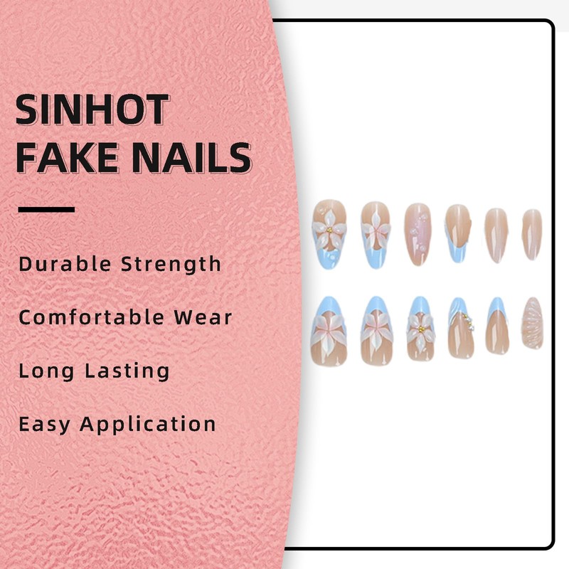 SINHOT Almond Press on Nails Medium - 3D Flower Fake Nails Glossy Glue on Nails White Pearls Nails Blue French Tip Stiletto Artificial Nails Stick on False Nails with Design DIY 24 pcs