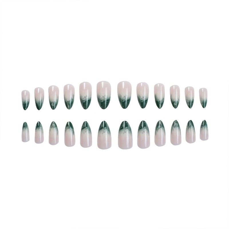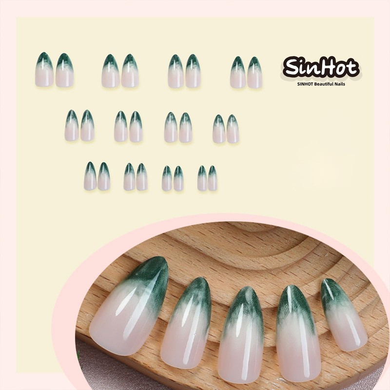 SINHOT Almond Press on Nails Medium - Dark Green Gradient Fake Nails Glossy Glue on Nails French Tip Acrylic Nail Stiletto Artificial Nail Art Stick on False Nails with Design DIY 24 pcs