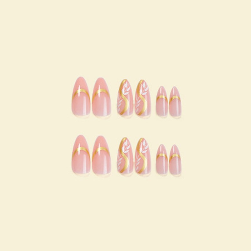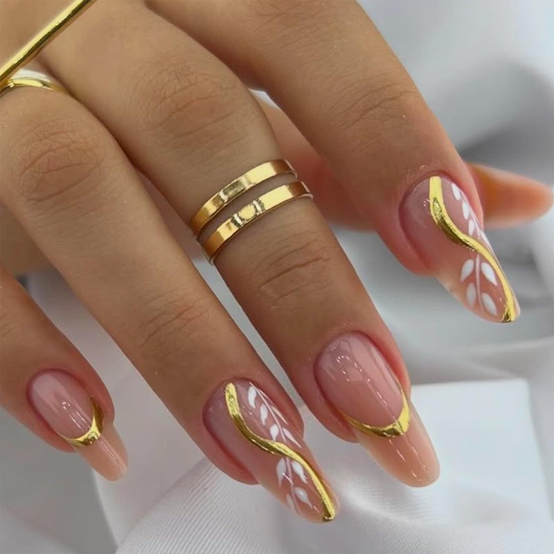 SINHOT Almond Press on Nails Medium Fake Nails Glossy Glue on Nails 3D Gold Chrome Stripes Acrylic Nails Stiletto Artificial Nails White Leaves Stick on False Nails with Design 24 pcs