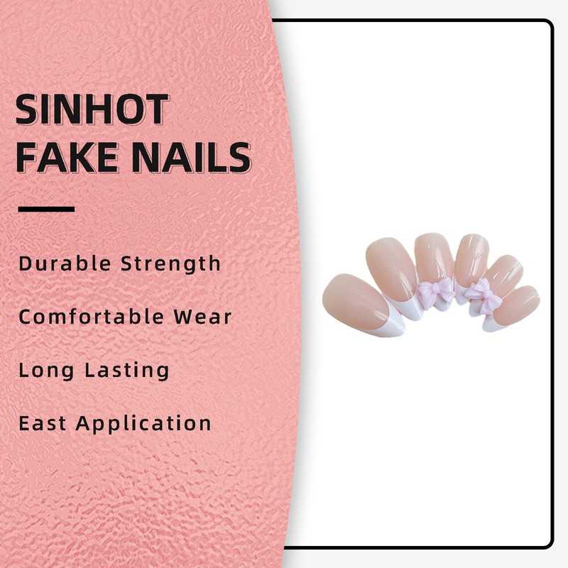 SINHOT Press on Nails Long Stiletto 3D Butterfly Fake Nails Glossy Glue on Nails White French Tip Acrylic Nails Almond Artificial Nails Stick on False Nails with Design 24 pcs