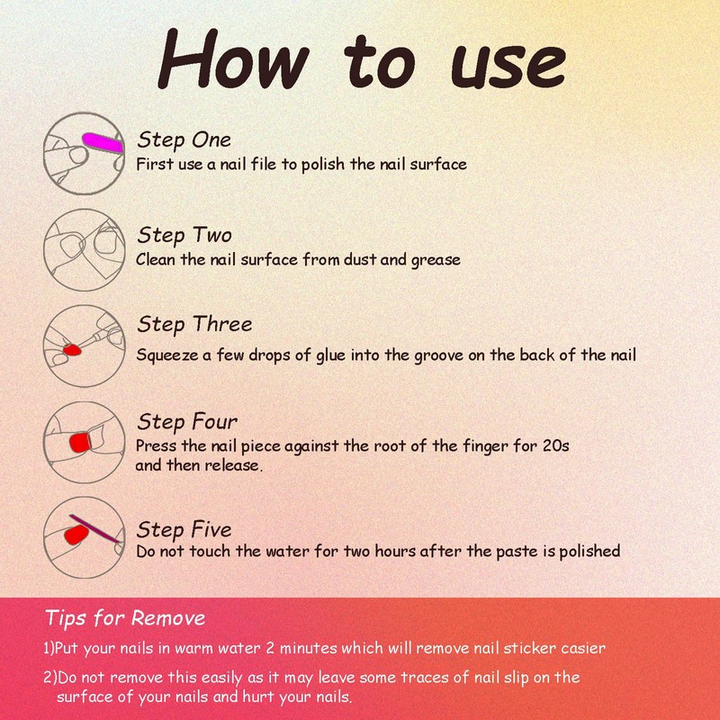 4. Select a right size of the nail, apply the glue to the back of the nail or use the adhesive tabs to attach the back of the nail and put it on your fingernails.