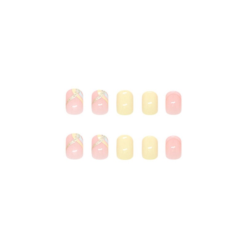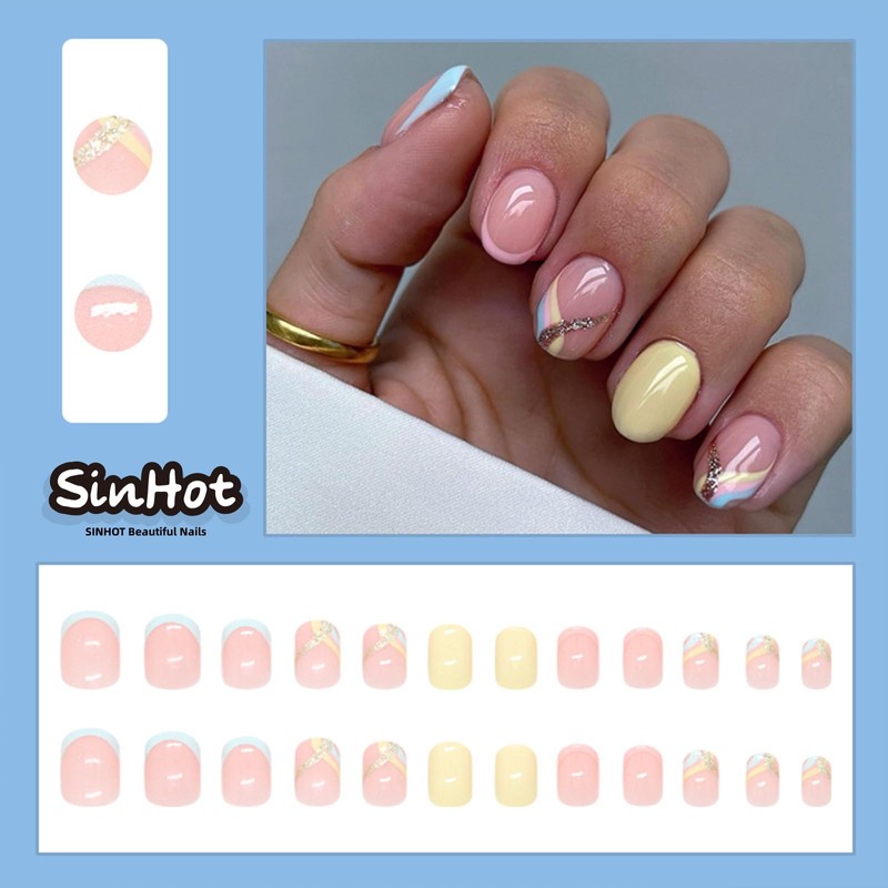 SINHOT Round Press on Nails Short - Gold Bling Glitter Fake Nails Glossy Glue on Nails Yellow Pink Swirl Acrylic Nail French Tip Oval Artificial Nails Stick on False Nails with Design DIY 24 pcs