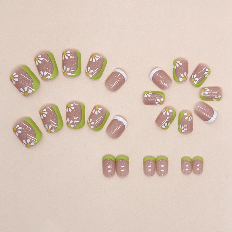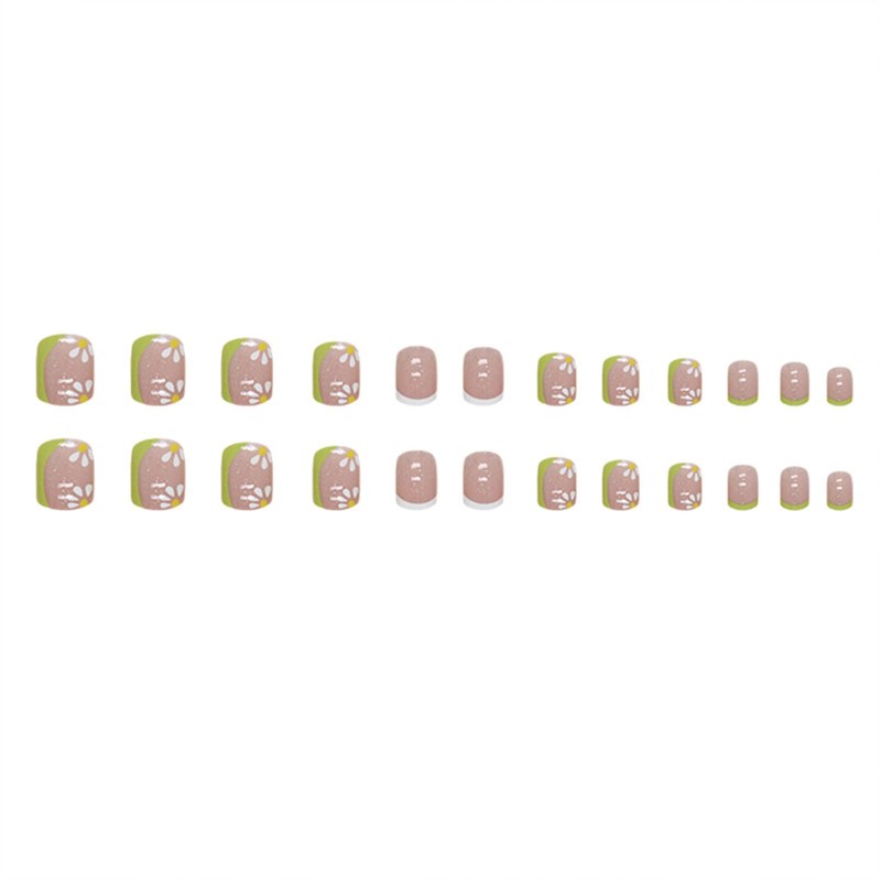 SINHOT Short Square Press on Nails Squoval Frech Tip Fake Nails Glossy Glue on Nails Green Acrylic Nails Cute Daisy Flower False Nails with Designs 24 pcs