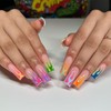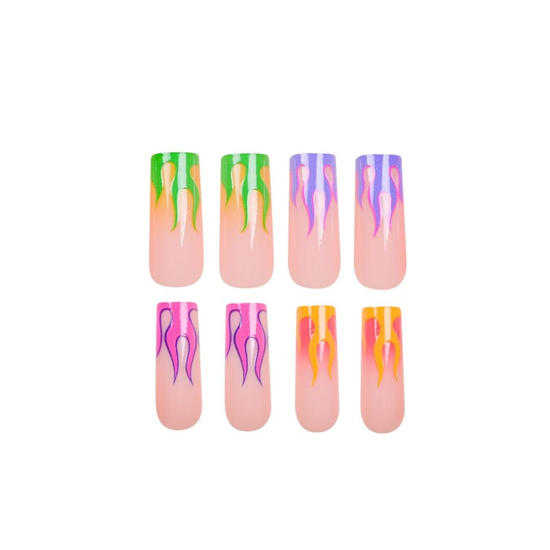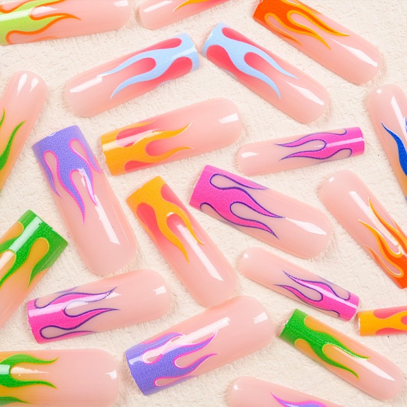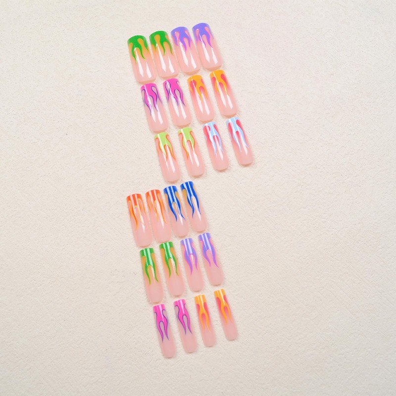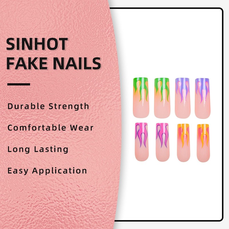 SINHOT Square Press on Nails Long - Colorful Flame Fake Nails Glossy Glue on Nails Rainbow Fire Acrylic Nail Supplies Squoval Artificial Nail Art Stick on False Nails with Design DIY 24 pcs