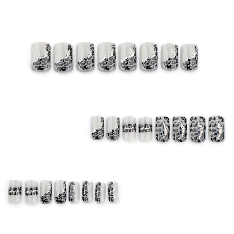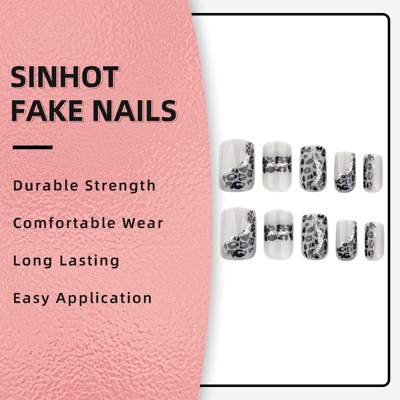 SINHOT Square Press on Nails Medium Fake Nails Glossy Glue on Nails Leopard Print Acrylic Nails Silver Bling Glitter Squoval Artificial Nails French Tip Stick on False Nails with Design 24 pcs