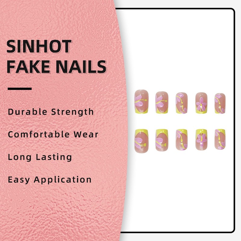 SINHOT Square Press on Nails Medium - Pink Flower Fake Nails Glossy Glue on N...