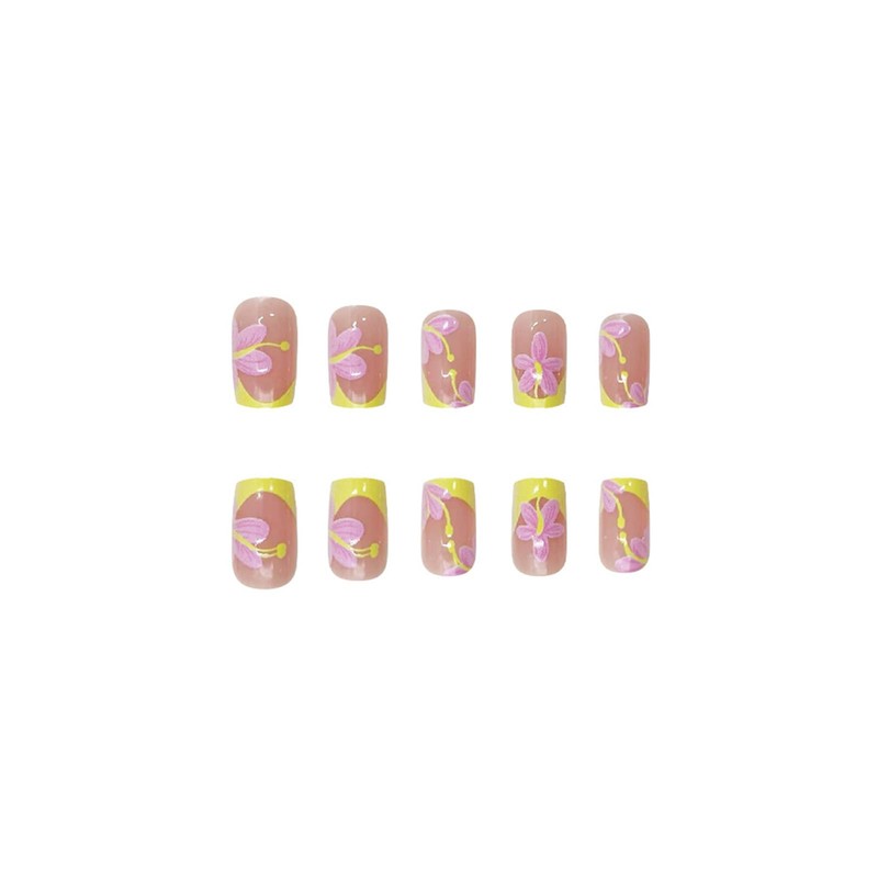 SINHOT Square Press on Nails Medium - Pink Flower Fake Nails Glossy Glue on Nails Yellow French Tip Acrylic Nails Squoval Artificial Nails Stick on False Nails with Design 24pcs