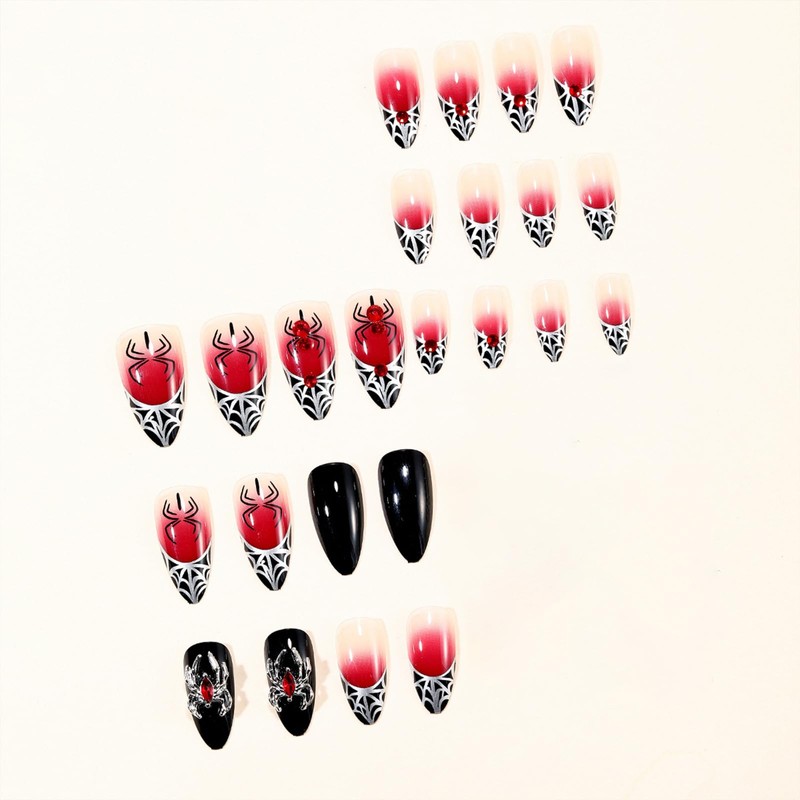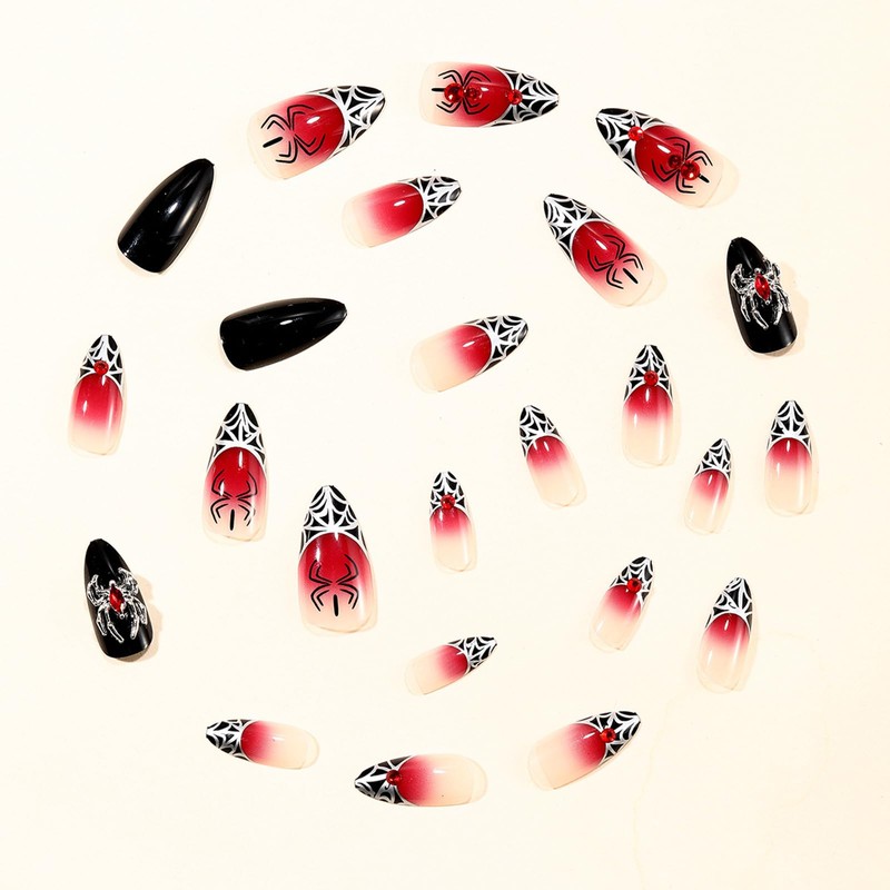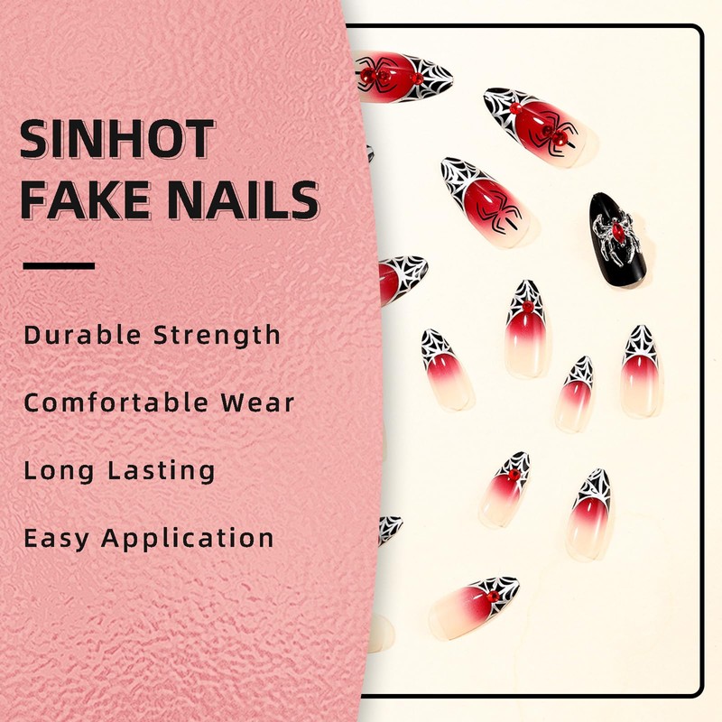 SINHOT Stiletto Press on Nails - Long Fake Nails, Glossy Finish, Goth Red Black & Gothic Spider, DIY Artificial False Nail Art - 24 Pcs Nail Kit with Glue