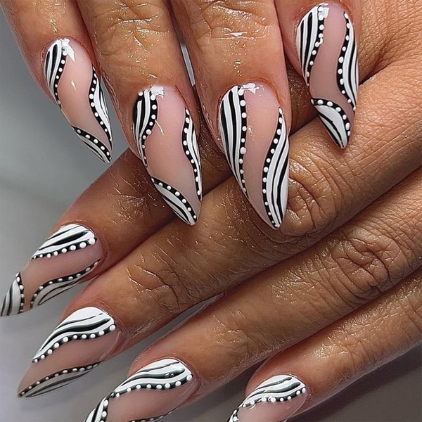 SINHOT Stiletto Press on Nails Long - Zebra Stripes Fake Nails Glossy Glue on Nails White Dot Nails Stiletto Artificial Nails Stick on False Nails with Design DIY 24 pcs