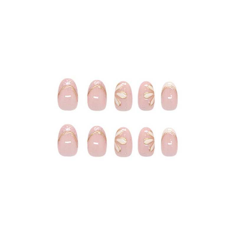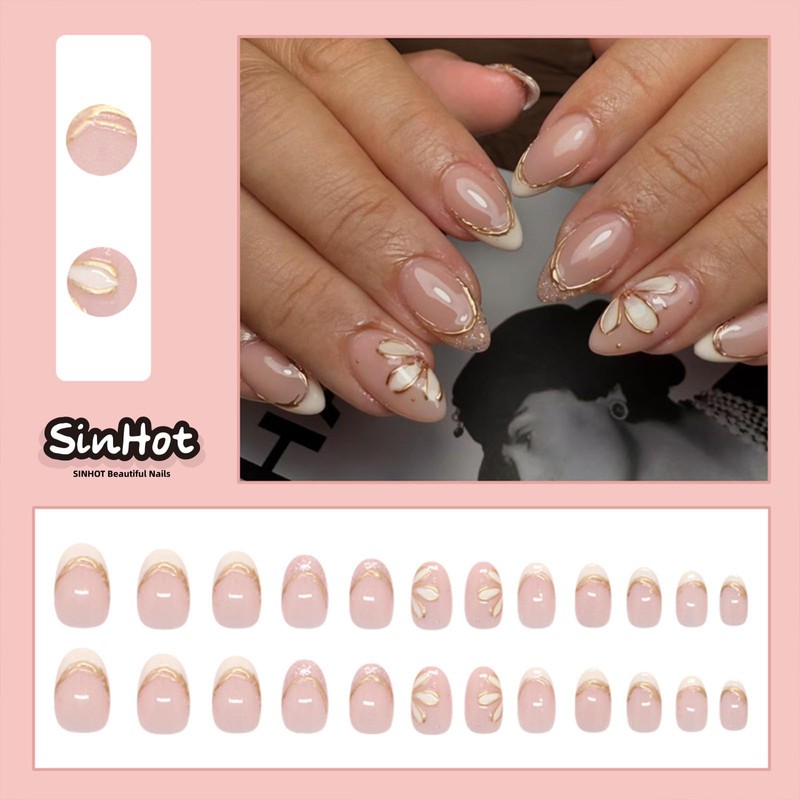 SINHOT White Flower Press on Nails - Medium Almond Fake Nails Glossy Glue on Nails 3D Gold Line Acrylic Nails Stiletto Artificial Nail Art French Tip Stick on False Nails with Design DIY 24 pcs