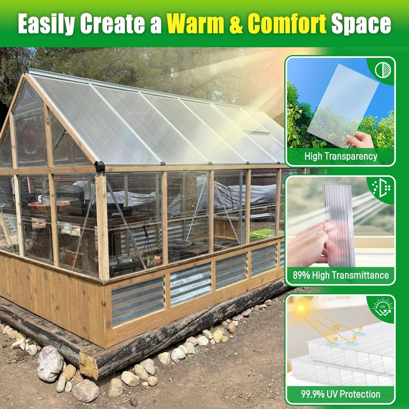 - High Transparency - The polycarbonate roof panels feature highly transparent material with a UV-resistant coating, effectively blocking 99.9% of UV while allowing an 89% light transmission. The double-layer structure diffuses light softly, promoting healthy and robust plant growth
