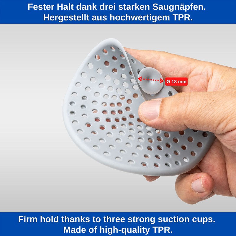 • Drain strainer with three strong suction cups – for drains up to a diameter of 70 mm. This drain strainer size is only suitable for standard drains in the kitchen and bathroom – drain fittings with strainer basket insert are not compatible – the inner diameter of the valve top can be max. diameter 70 mm.