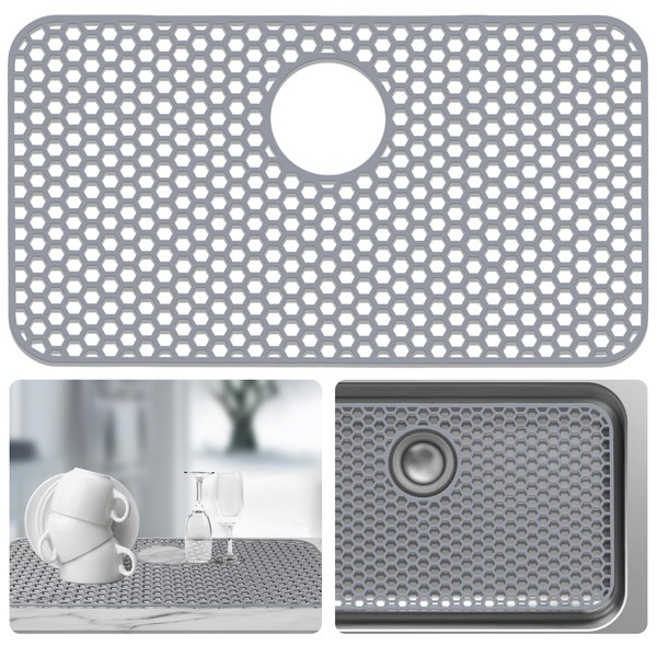 Sink Protectors for Kitchen Sink - 26"x 14" with Rear Drain Hole Heat Resistant Easy Clean Non-slip Silicone Kitchen Sink Mat for Bottom of Kitchen Sink Stainless Steel(Grey)-66x35CM