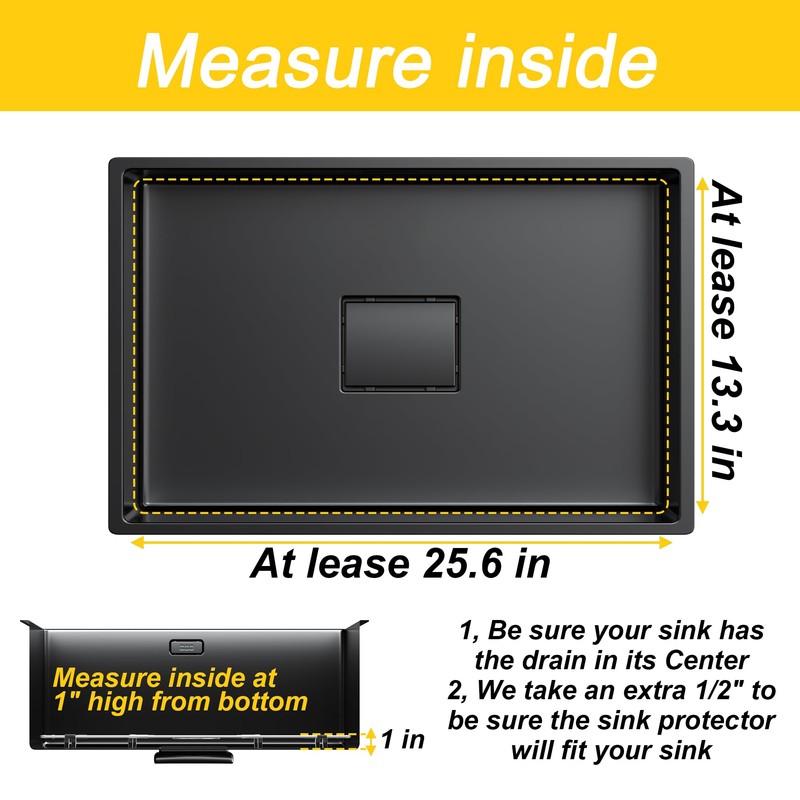 - Dimension:25-1/8" x 12-7/8",Centered Drain,Drain Hold Dia:5.1" How to Measure: Please measure inside 1" from bottom of your sink to get the right size of grid, neither the top nor the bottom. There is side bumper on the grid, so please reserve at least 1/2" for both length and width with your measured size. And make sure you have feet placed to compensate for the rounding at bottom of sink.