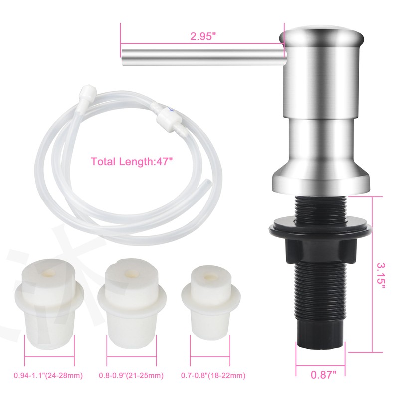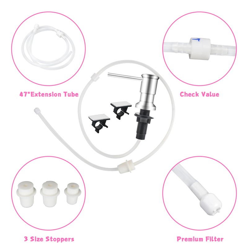 - 【What You Get】We supply an Sink soap dispenser pump head, 47” extension tubes, 3 multiple stoppers to fit most of soap and lotion containers, a check valve connect 2 tubes, 1 pp balls and 3 fastening bolts.