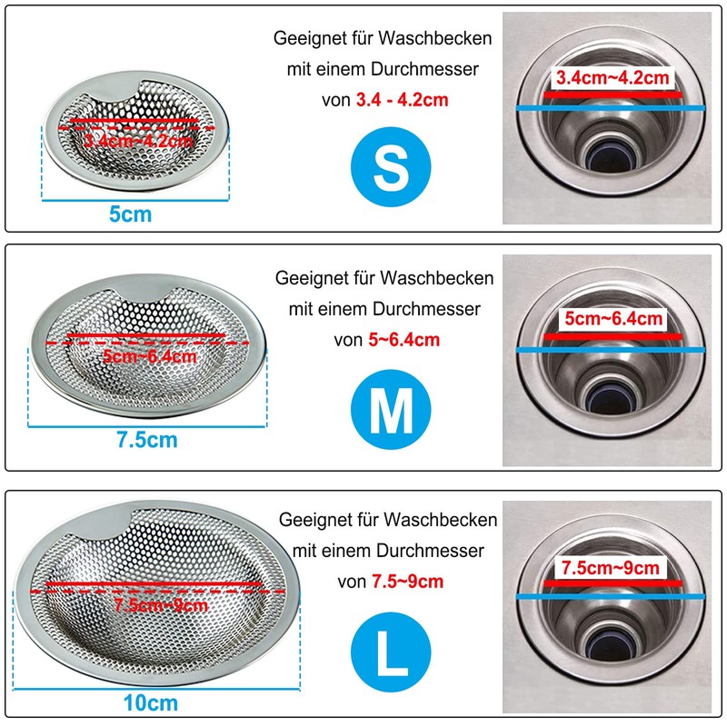 - STAINLESS STEEL The stainless steel drain guards are durable, rust-proof, you don't have to worry about frequent replacement. Approximate outer diameter: 5.2 cm, 7.6 cm, 10.2 cm.