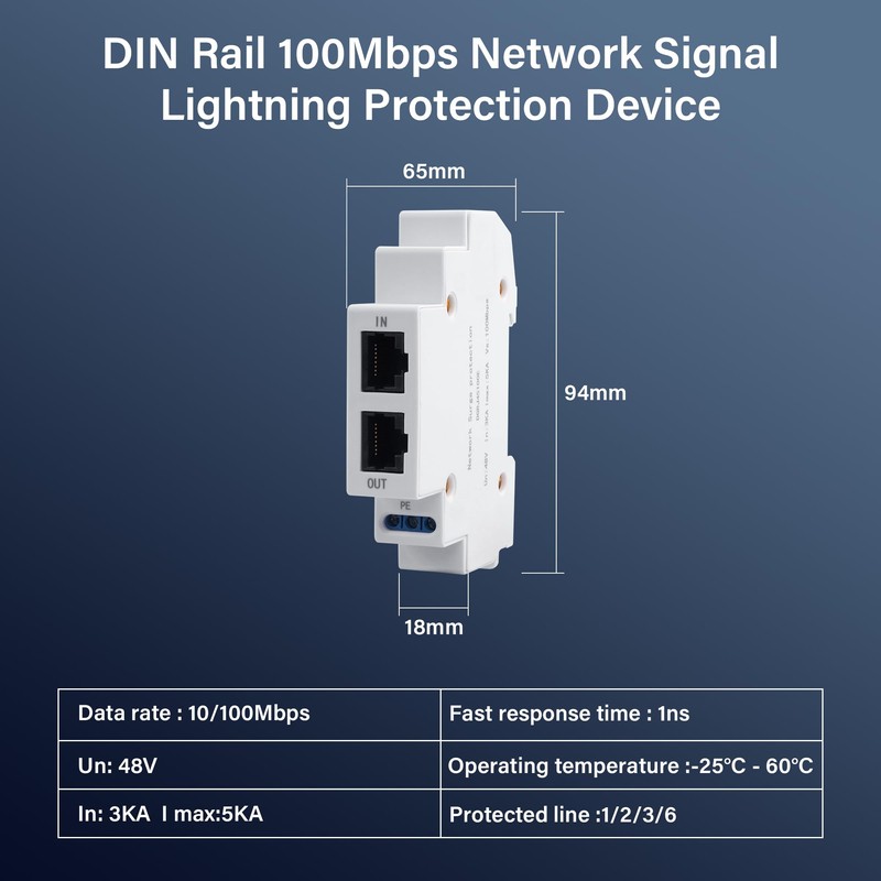 - 【Features】Data Rate(100Mbps). Protective pin(1/2/3/6). Nominal voltage Un(48V).Max discharge current(5KA).Fast response time (1ns).Operating temperature range(-25℃ to +60℃)