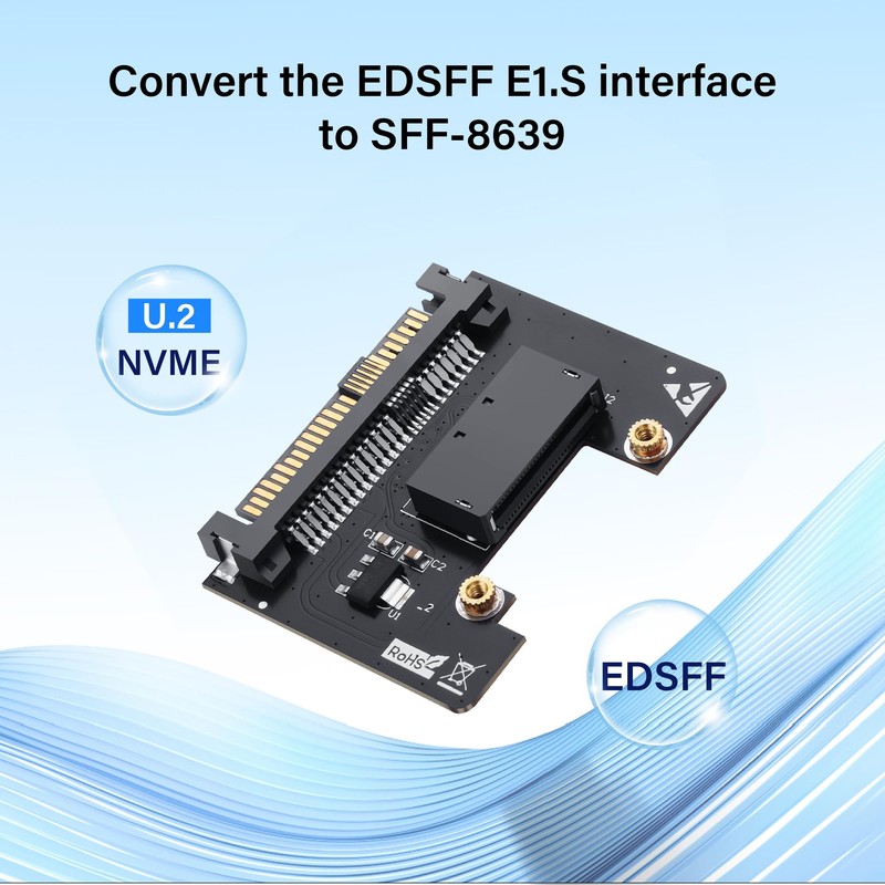 • U.2 SFF-8639 host adapter converts EDSFF E1.S SSDs to U.2 SSDs for use in IoT, data centers and servers
