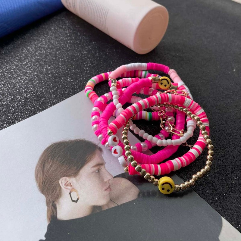 SINLOV 8Pcs Boho Layered Clay Bead Bracelet Set Eyeball Simle Heart Elastic Bracelet Colorful Star Soft Pottery Bracelet Adjustable Dainty Hand Jewelry for Women (Pink)