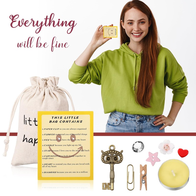 - Small but Meaningful: the bag measures 3.94 x 5.51 inches/ 10 x 14 cm, and contains 8 mini gifts with special meanings, including flowers, diamonds, paper clips, hearts, wooden clips, buttons, keys and candles; There is also a small card describing the meaning of each gift; It is small and portable and can be carried with you to give people strength and comfort at any time
