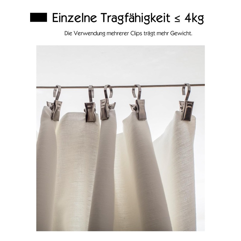 Curtain clips made of iron are robust and durable and not prone to rust. A single curtain clips can carry a weight of no more than 4 kg, and their load capacity is very strong. Therefore, you can use curtains clips to curtains, shower curtains, LED light chains, photos, woven items, etc.