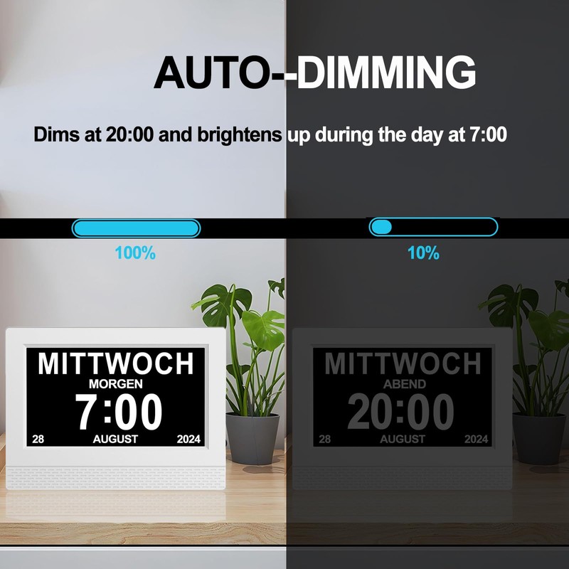 - Automatic dimming for night use: the clock display automatically dims every night at 20:00 at approx. 85% and automatically returns to full brightness at 7:00 the next morning. Ideal for the elderly, visually impaired and those with macular degeneration. The sharp, glare-free, clear display with its cut-outs can be seen from the other side of the room.