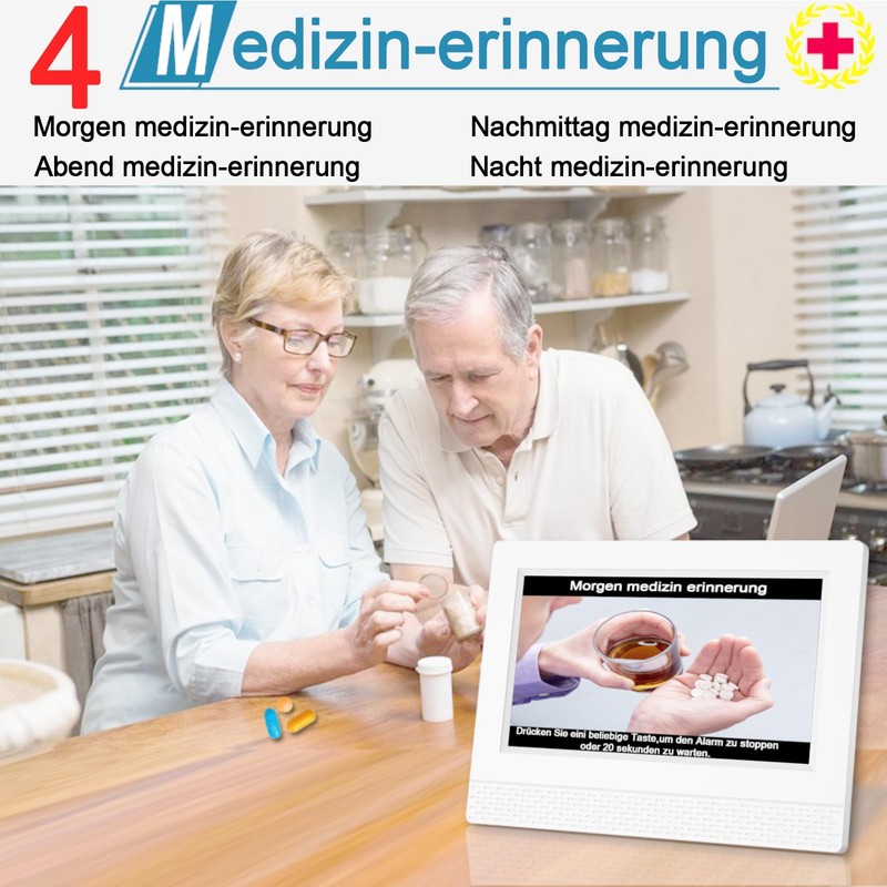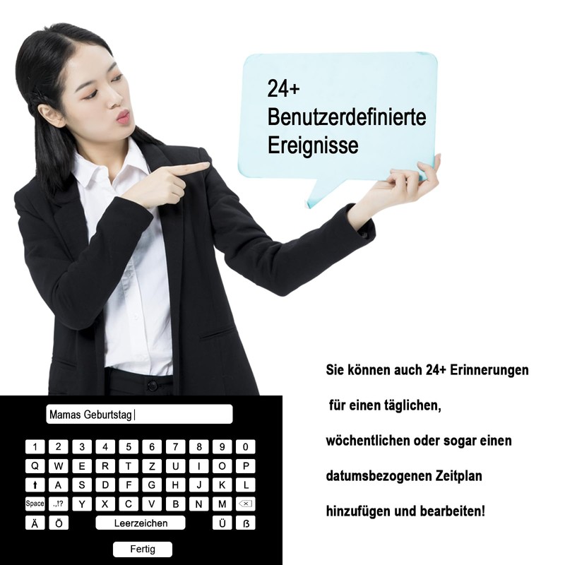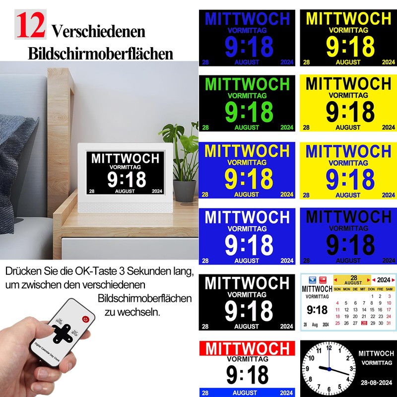 - 24+ Custom Reminders This day and date dementia clock for the elderly not only contains alarm settings, but also reminders for medication and drinking water. Even more unique is that you can also add, edit or upload 24+ reminders for a daily, weekly or even date-specific schedule!