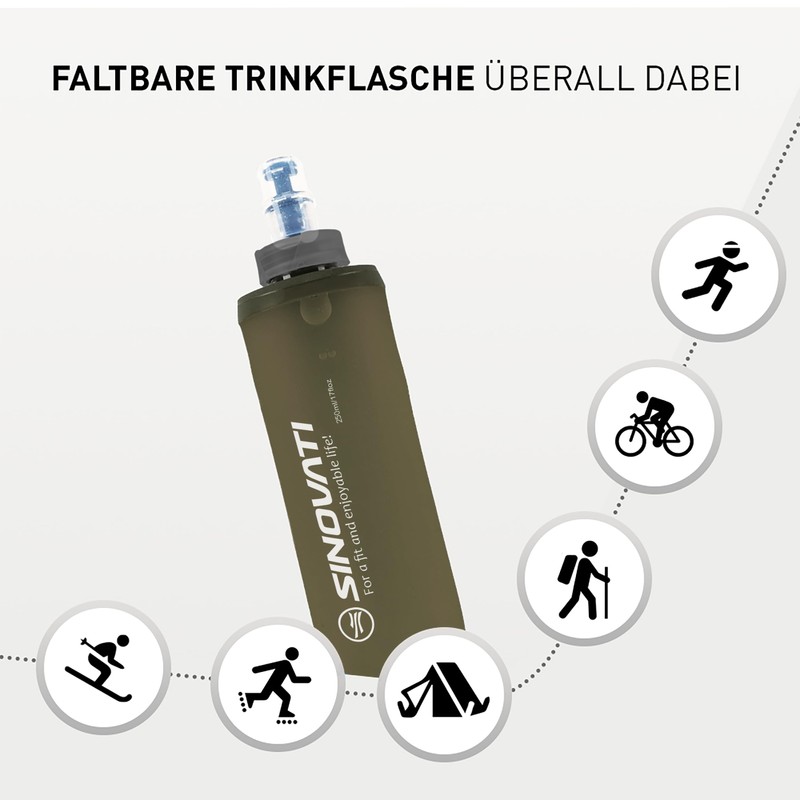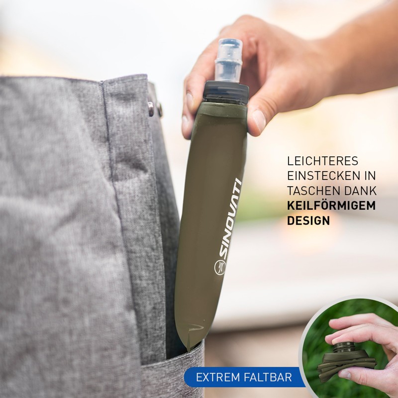 • LEICHT UND PRAKTISCH: eine SINOVATI faltbare Trinkflasche wiegt weniger als 50g! It is foldable and requires very little storage space, so it fits anywhere. The flat tail design makes it easy to insert into the side pocket of the backpack or chest pocket.