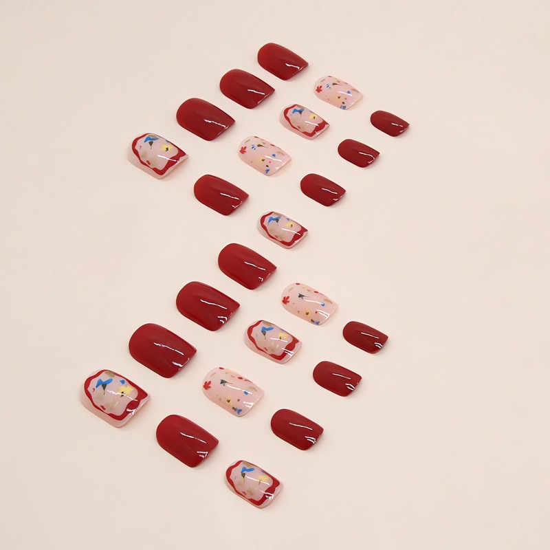 SINSEN Press on Nails Short - Wine Red Press on Nails with Small Flower Designs, Square Fall Fake Nails with Adhesive Glue Stickers, Reusable Stick on Nails in 12 Sizes, 24 Pcs Short Square Nails