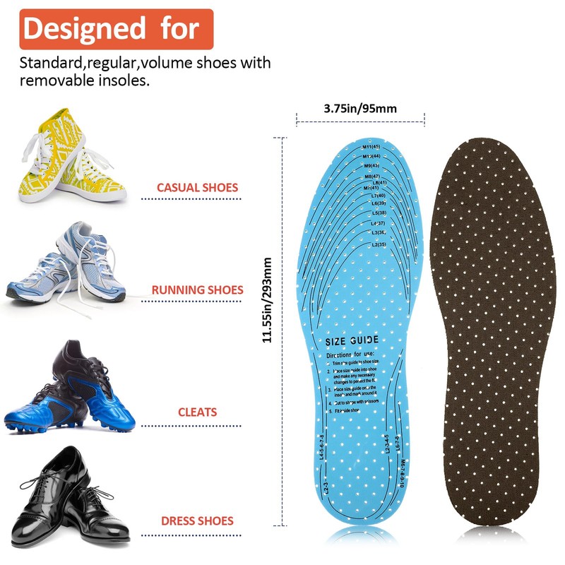 - Considerate Design: comfort insoles fit well inside your shoes, and you can trim the size to fit virtually any shoe (starting at UK 2 Women's/ 35 EUR up to UK 11 Men's/ 45 EUR); The soft insoles feature a nice shoe fit; Bottom layer of grip foam stays in place with less wrinkling and bunching