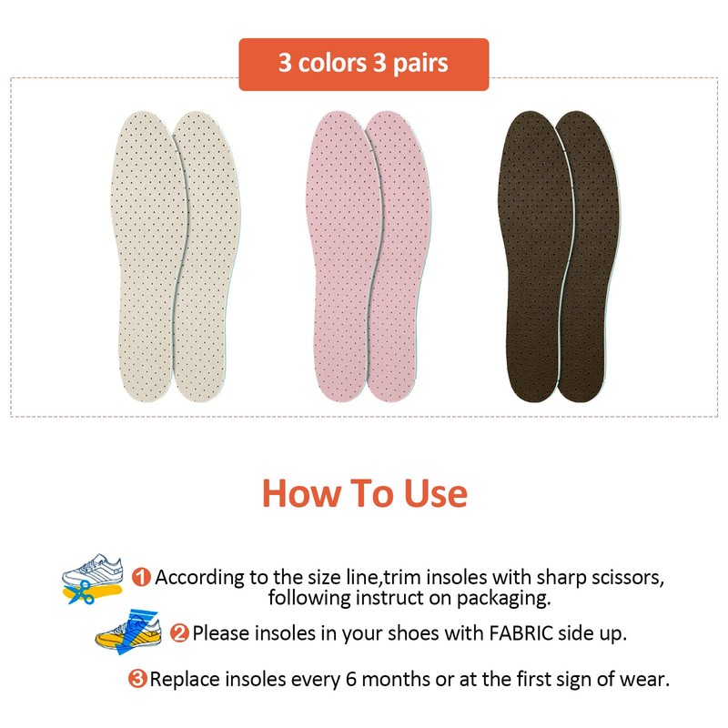 - What you get: the package contains 3 pairs of double layer latex insoles in 3 different colors, and the average thickness is approx. 3 mm, sufficient quantity and different colors to meet your daily use and replacement needs