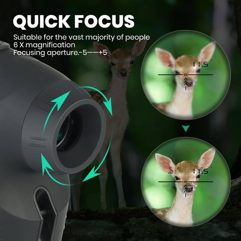• Manual Focusing:Turn the focusing knob to manually focus until it is clear. Aim at the hunting target, perform one-key measurement, and obtain accurate measurement data on the display screen. One-key switch of units (meters/yard). Focusing aperture: -5 to +5