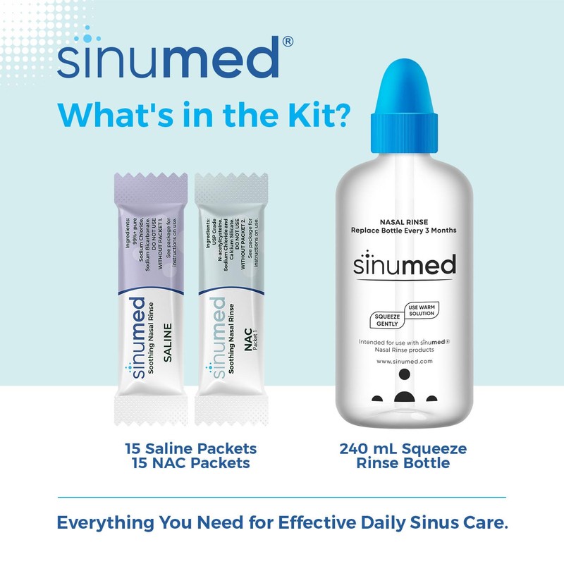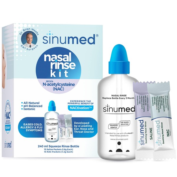 SinuMed Sinus Rinse, 30PK Nasal Rinse Packets with NAC and Saline, Squeeze Bottle, Alternative to Neti Pot, Helps with Allergy, Congestion, Cold Symptoms