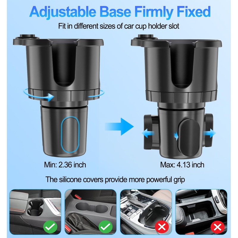 - 👍【ADJUSTABLE CUP HOLDER】It comes with a base that can be expanded from 2.43" to 4.4" in diameter and three silicone covers, which allows the adapter to stay firmly in place, regardless of how rough the terrain gets. This cup holder expander fits most vehicle cup holders, but it does not work well in square, hexagonal, semi-circular, recessed or hidden cup holders