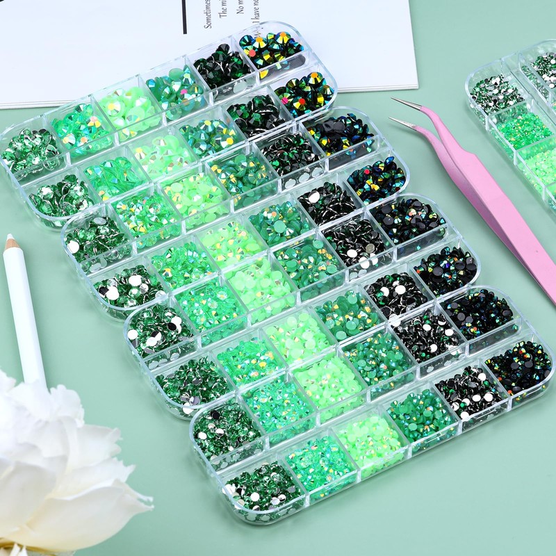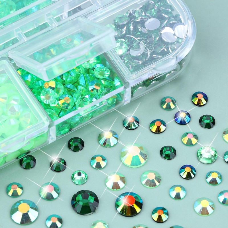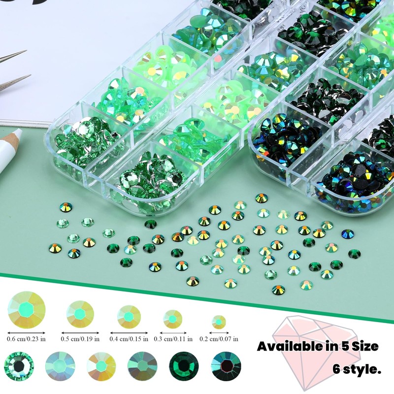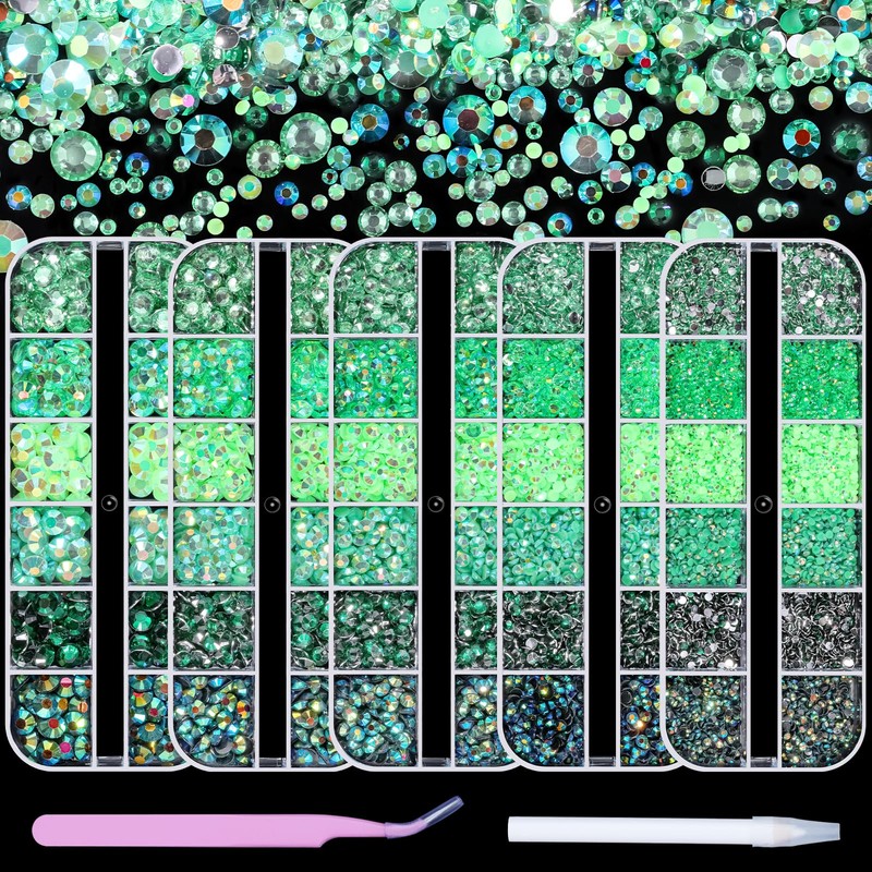 Sinyanail Green Flatback Rhinestones Kit for Nails, 12780pcs 2-6mm Mixed Sizes Crystals AB Transparent Jelly Rhinestones Stones Round Manicure Gems with Pickup Pen and Curved Tweezer (5 Box-Green)