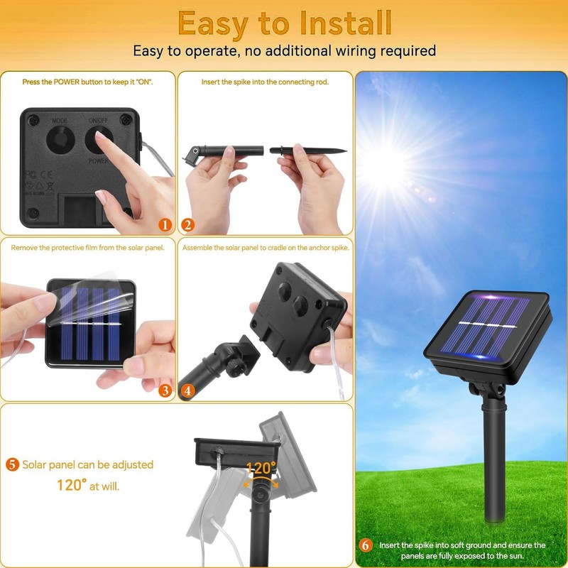 - 【8 Beleuchtungsmodi】12 m 100 LEDs superhelle Lichterkette mit Multi-Beleuchtungsmodus einschließlich Kombination/In Wave/Sequentiell/Slow Glo/Chasing/Slow Fade/Twinkle/Steady On. Sie können den gewünschten Modus für verschiedene Anlässe auswählen.Diese Lichterkette kann tagsüber aufgeladen werden und schaltet sich bei Dämmerung automatisch ein und bei Sonnenaufgang aus.