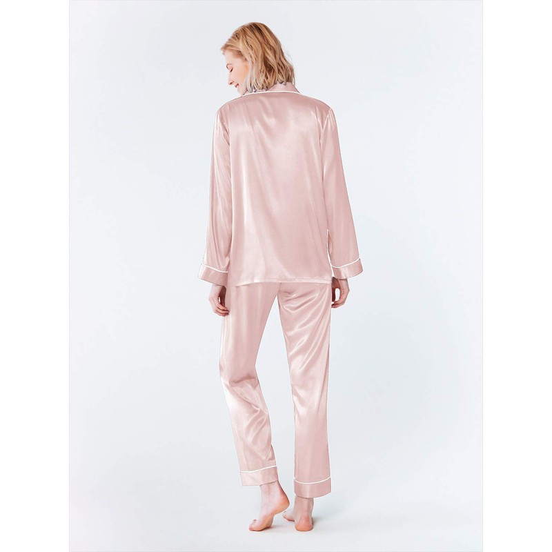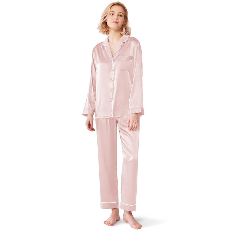 This is luxury SIORO silk satin pajama sets decorated with contrast piping. It is pajama suit that will make you feel great in a bedroom and also a stylish for lazy Weekends at home.