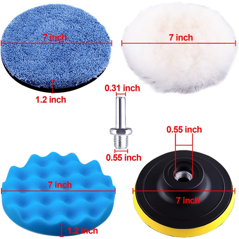 - Car buffing set - package include 5 pieces 7 inch buffing pads (wave), 1 piece woolen buffing pad, 1 piece drill adapter, 1 piece hook and loop pad, 1 piece microfiber fast finishing pad, 2 pieces microfiber car polishing bonnet and 2 pieces waxing bonnet, 13 pieces car buffer and polisher pads set in total