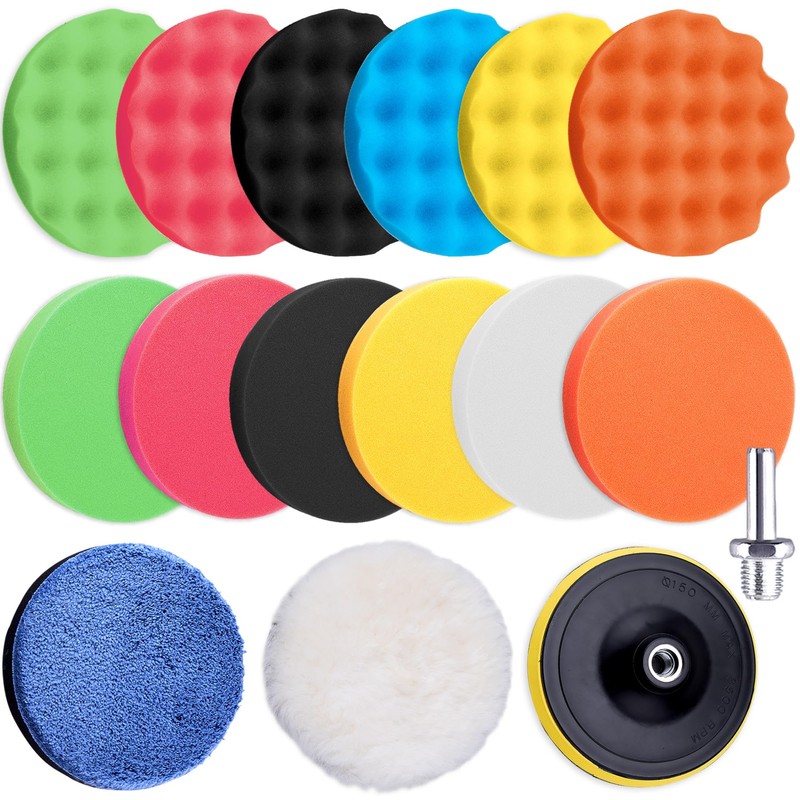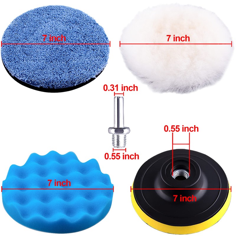- Practical polishing set - package include 12 pieces 7 inch buffing pads in 2 shape, 1 piece microfiber fast finishing pad, 1 piece woolen buffing pad, 1 piece drill adapter and 1 piece hook and loop pad, 16 pieces 7 inch car buffers and polishers set in total