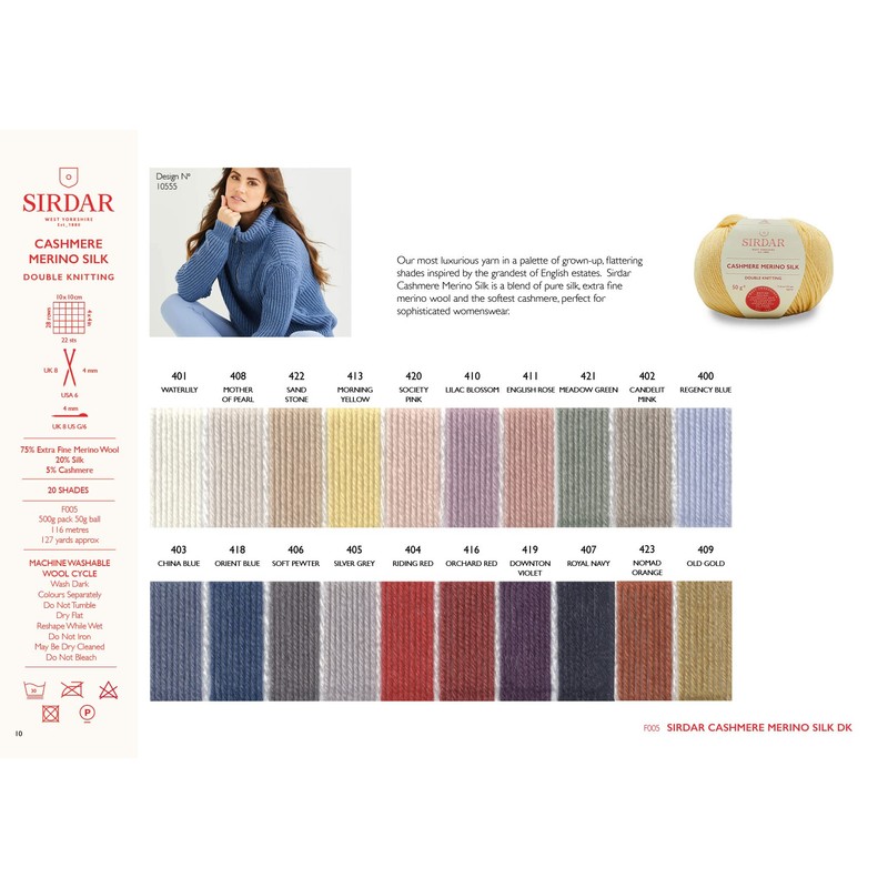 - Cashmere Merino Silk DK by Sirdar is a luxurious knitting yarn in a sumptuous palette inspired by grand old English estates.