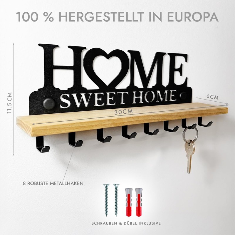 SirHoldeer Key Rack with Shelf Made of Real Wood and Metal, Wall Organiser with 8 Hooks for the Hallway, Home Sweet Home Design for Wall Mounting