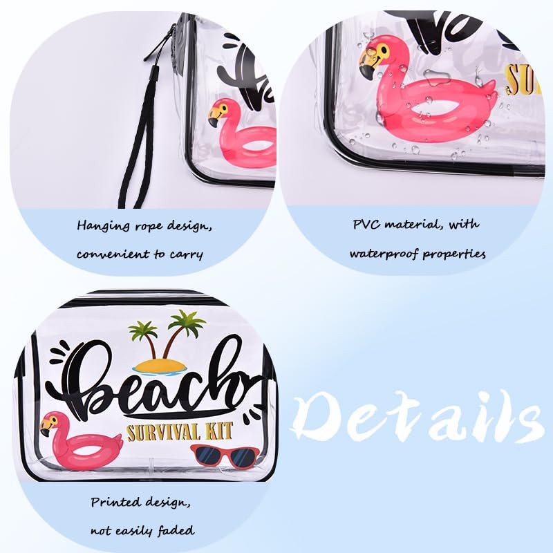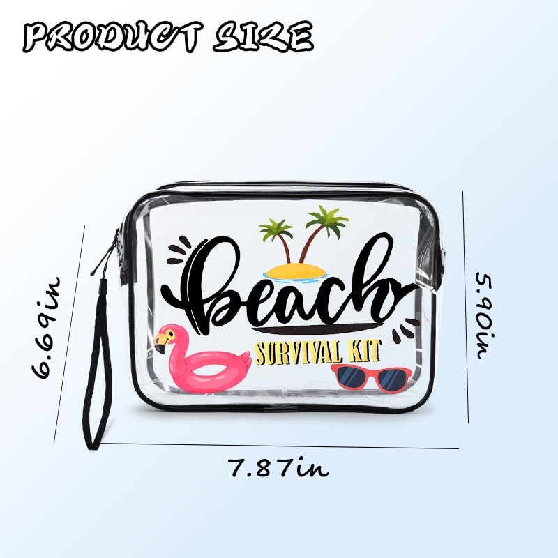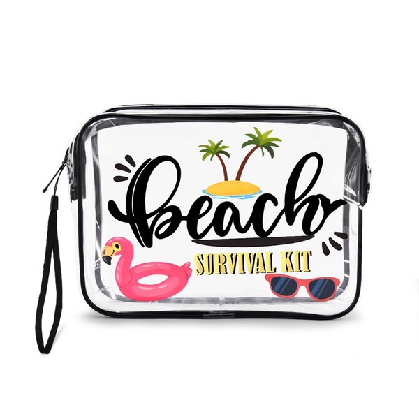 - Beach Themed Clear Toiletry Bag for Travel: Stand out with our clear bags for beach lover, which printed with cute flamingo float, palm trees, sunglasses motifs and bold Beach Survival Kit, adds a fun, tropical vibe to your beach outings, transparent cosmetic makeup storage bags for women girls, clear travel toiletries bag for towels, transparent makeup organiser for handbag tote bag