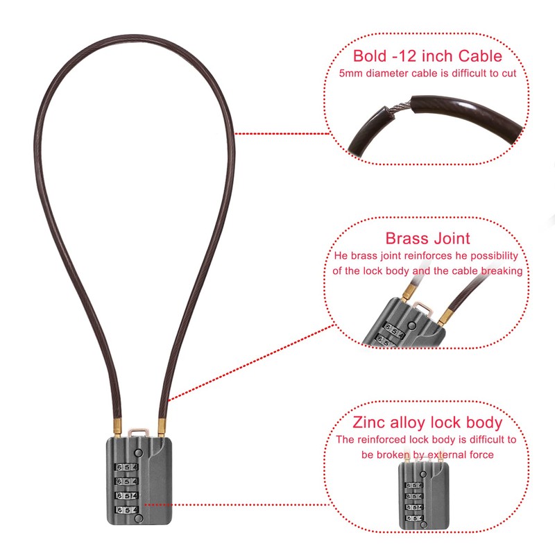 - Special Design:Padlock is constructed from zinc alloy,50cm(19.6in) steel cable is made from 5 mm diameter bold cable for strength and flexibility,Compact size,light weight,and convenient for you to store and carry