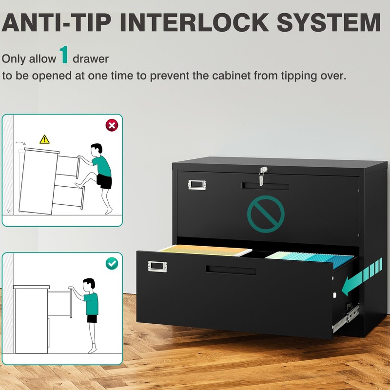 SISESOL 2 Drawer Lateral File Cabinet with Lock,Black Lateral Filing Cabinet,Horizontal Metal Filing Cabinets,Locked Wide Two Drawer File Cabinets for Office Home,Fit A4/F4/Letter/Legal File