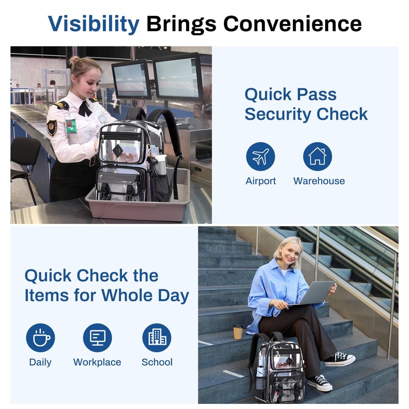 - 【Classic and Functionality in One】The classic look of this transparent backpack is elevated with a sleek leather pendant, adding a stylish touch to your outfit. It features visibility allow you to pass through security checkpoints quickly, but also allows you to quickly efficiently check that you pack everything you need for your school/daily/work/stadium events essentials