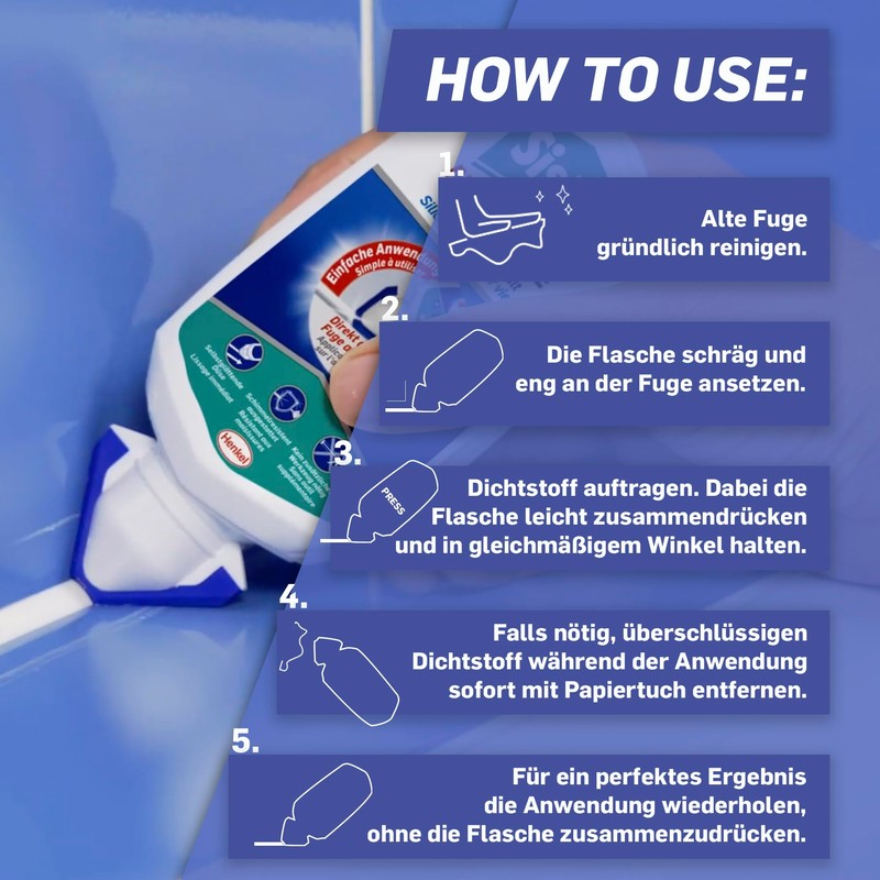 Die alte Fuge muss grndlich gereinigt werden, sodass die Oberfl?chen sauber und trocken sind. Die Flasche auf die Fuge setzen und sicherstellen, dass die Dse eng anliegt, um eine optimale Abdichtung zu gew?hrleisten. Die Flasche beim Auftragen leicht zusammen drcken und darauf achten, dass die Dse in einem gleichm??igen Winkel gehalten wird. Diesen Schritt fr ein perfektes Ergebnis wiederholen. Falls n?tig, berschssige Fugenmasse sofort mit einem Papiertuch entfernen.