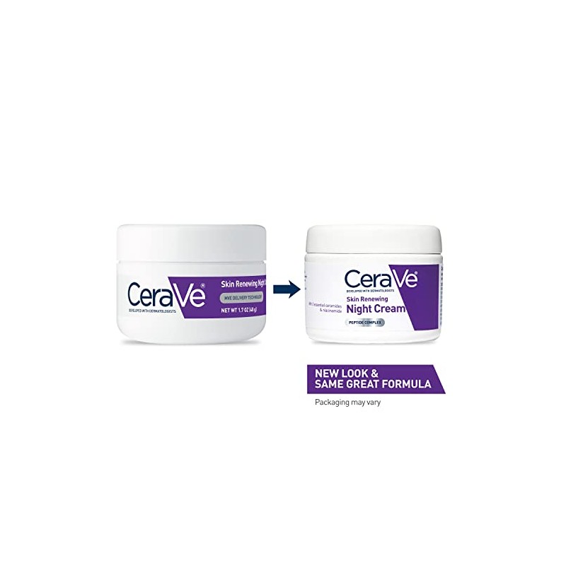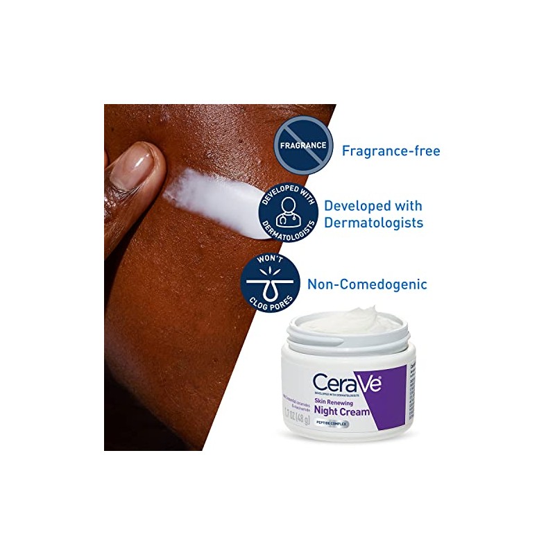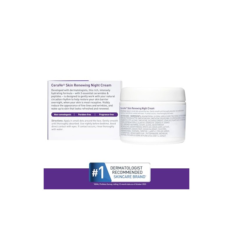 Desarrollada con dermatólogos, la crema de noche renovadora de piel CeraVe ayuda a refrescar el aspecto de la piel cansada durante la noche con ceramidas reparadoras de la piel.