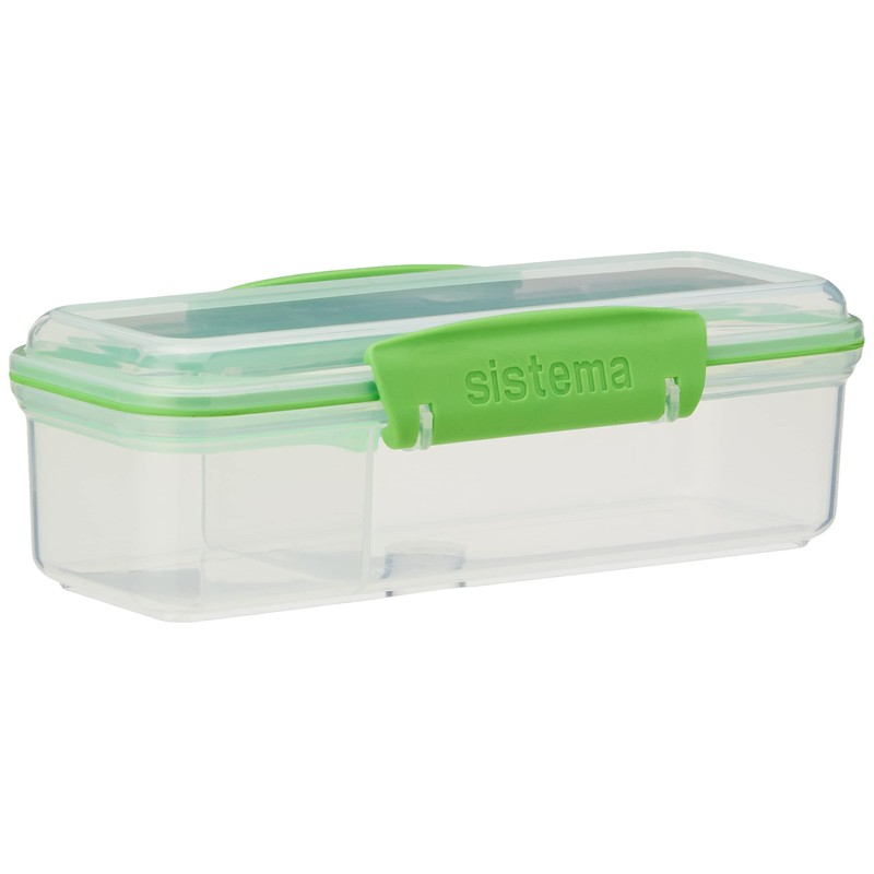 - This handy Sistema travel snack container has a split design that lets you store 2 different foods, like a veggie and dip, separately
