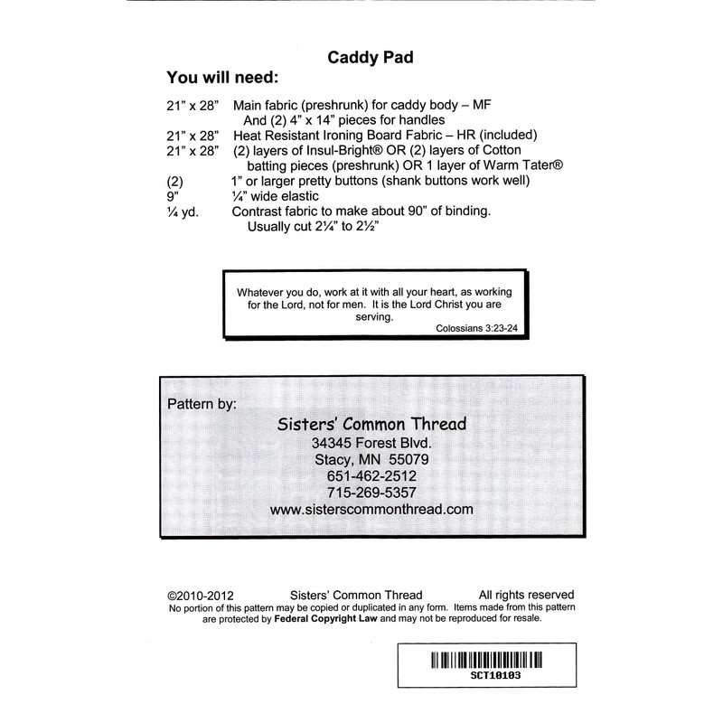 - Clever iron tote and pressing pad in one. Includes heat resistant fabric to make one Caddy Pad. Sized for a full size iron.