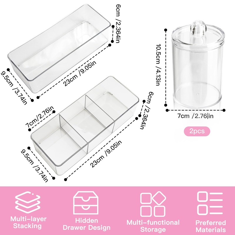 - Praktisches Make-up Organizer Set: Sie erhalten 3 verschiedene Arten von Organizern. Eine Box mit einem Fach zur Aufbewahrung von langen Gegenständen wie Schminkpinseln. Eine Box mit 3 Fächern zur Aufbewahrung von Kleinteilen wie Lidschatten, Puder, Lippenstiften usw. Die Abmessungen sind 23x9,5x6 cm. 2 Qtips-Halter für Wattestäbchen, Wattepads, Make-up-Entfernerpads und mehr. Getrennte Kategorien, effiziente Aufbewahrung.